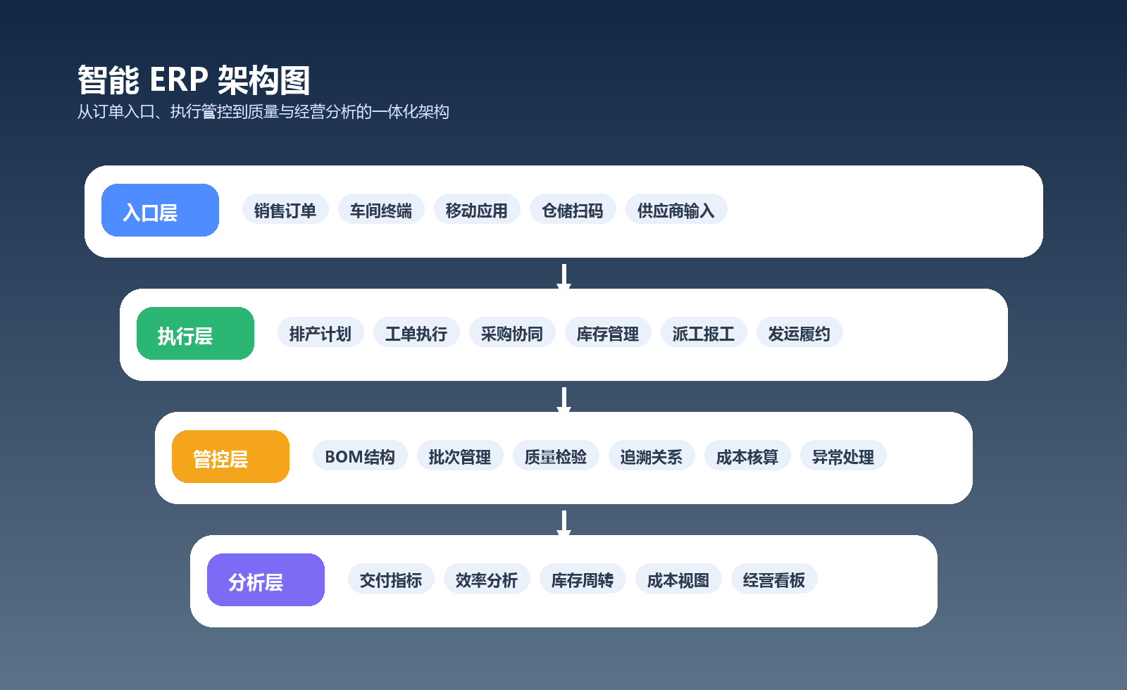 这些问题本质上不是某一个岗位不努力,而是企业缺少统一的数字化经营底座。智能 ERP 解决方案的设计重点,就是帮助企业把订单到交付之间的关键节点全部纳入系统管理,让计划、执行、反馈、分析形成闭环,减少过程不确定性。