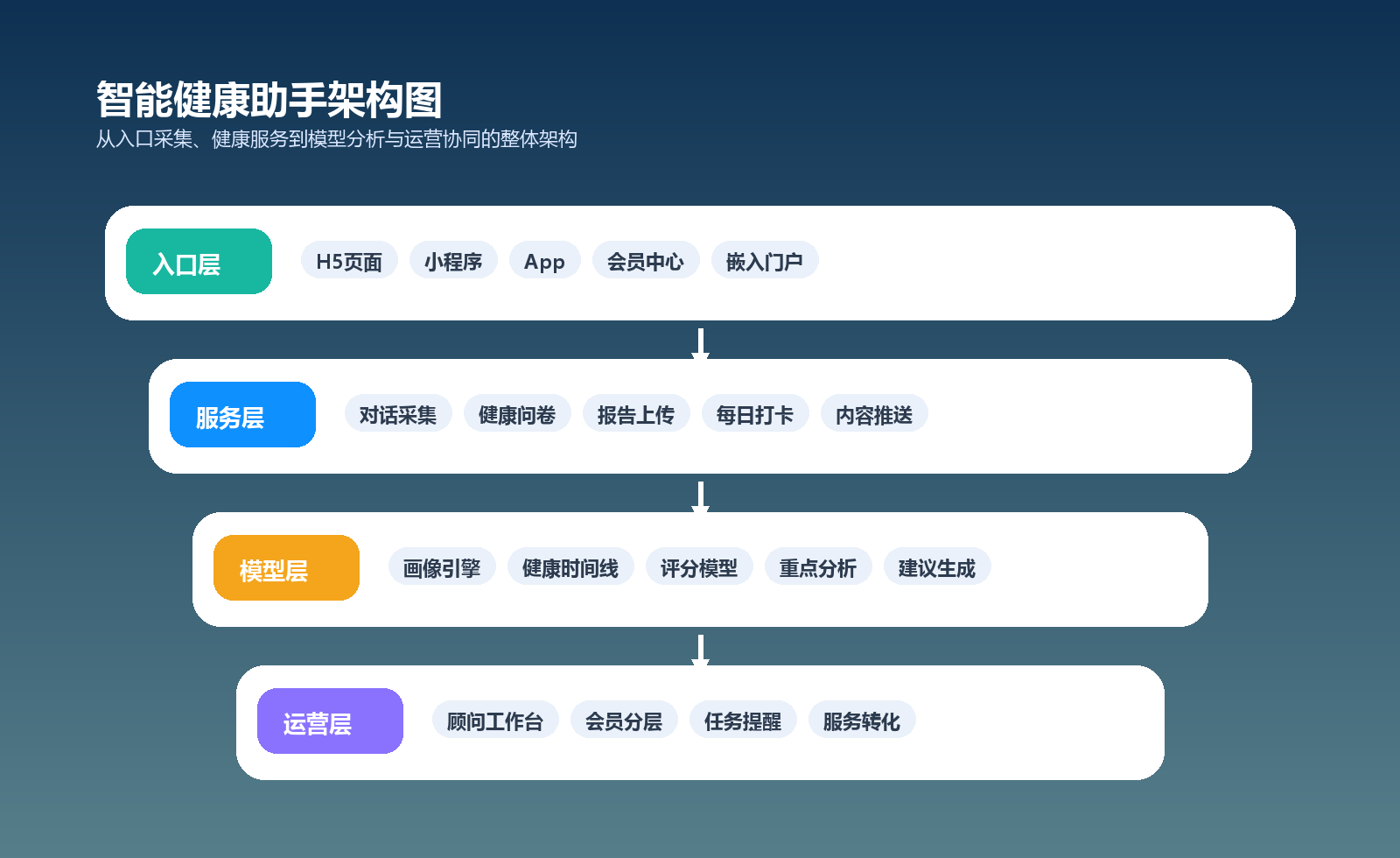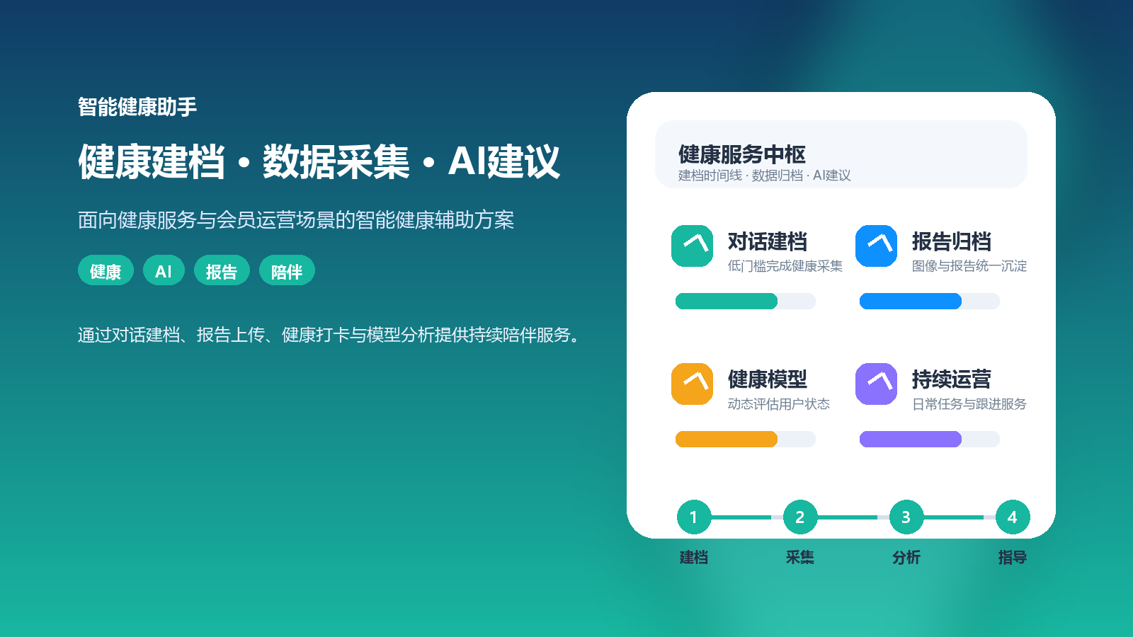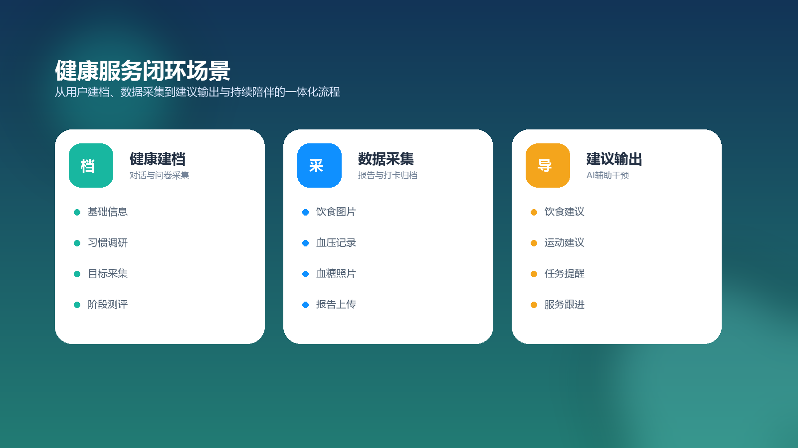 | 健康管理中心 | 提升建档效率,形成连续追踪机制 | 对话采集、报告上传、用户画像、AI建议 |