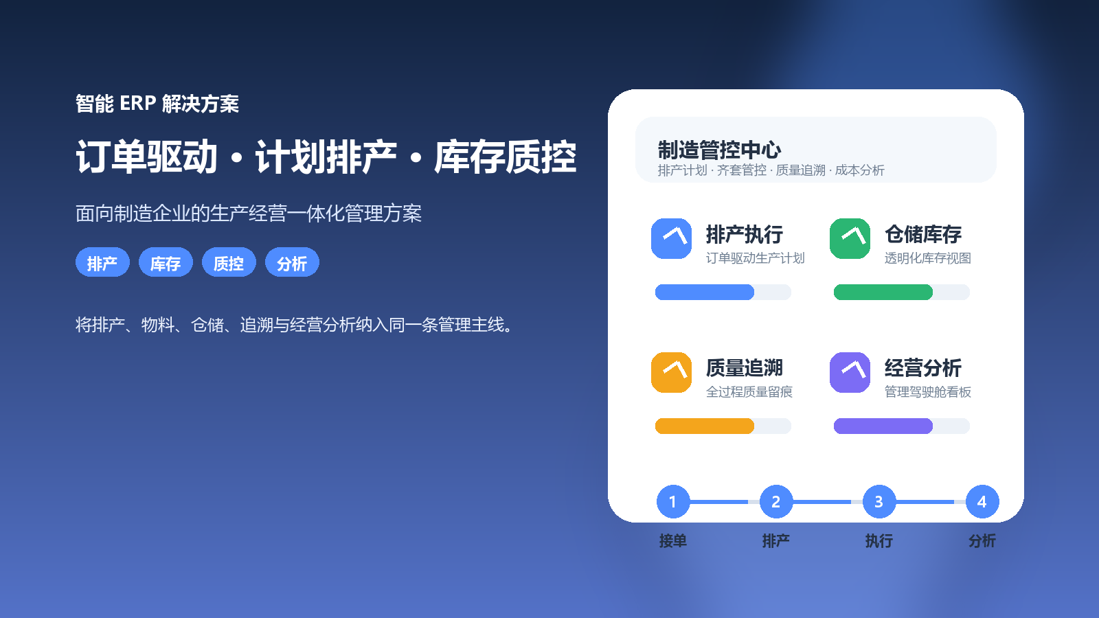 订单、计划、库存、质量和经营分析贯穿同一管理链路,帮助制造企业实现从接单到交付的全流程可视化。